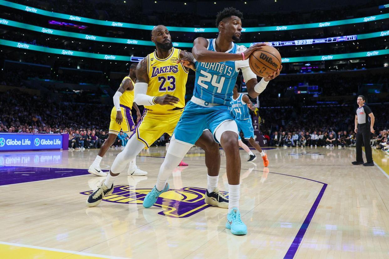 鲍尔、布里奇斯携手外线发难,黄蜂取得17分领先。东契奇与克尼佩尔在禁区斗法,鲍尔封盖拉拉维亚,文森特空位远投不进。詹姆斯上篮打进,夏洛特请求暂停。米勒跳投取分,范德比尔特补篮得手还以颜色,詹姆斯抢断鲍尔后打成了2+1。鲍尔、布里奇斯、米勒相继单打不中,詹姆斯低位跳投取分,分差仅为10分,湖人看到了逆转取胜的希望。